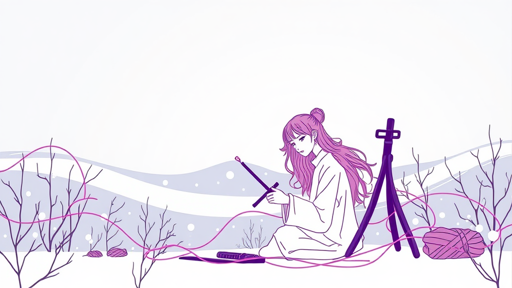 Flat illustration, line art, exploring Types of Minimalists, a female artist immersed in her craft, influenced by the style of Tsutomu Nihei, incorporating flowing purple lines and gentle pink highlights, set against a backdrop of rustic winter colors that evoke a serene, frosty landscape, balancing simplicity with artistic depth.