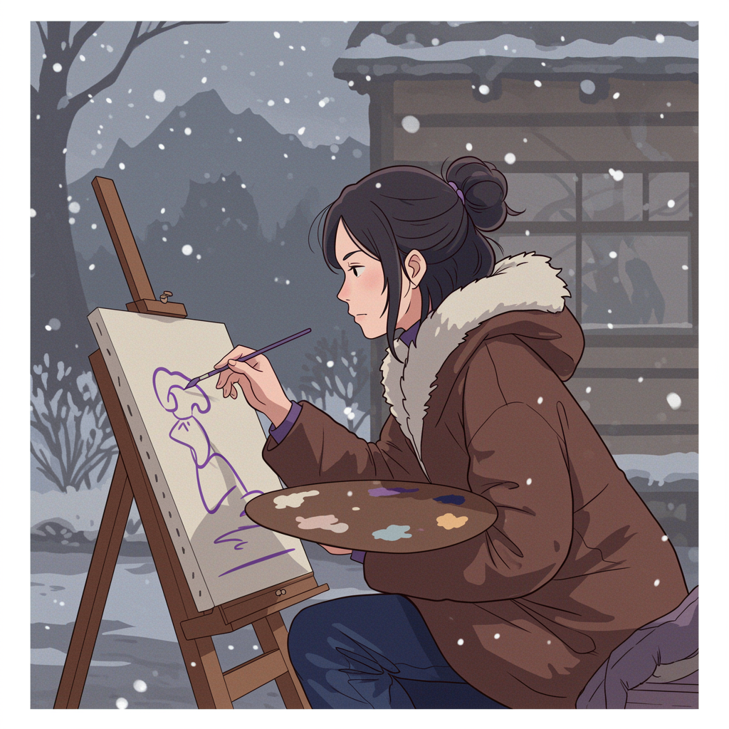 Flat illustration line art of a female minimalist artist painting, inspired by Tsutomu Nihei, featuring a purple line with pink highlights against a rustic winter color background.
