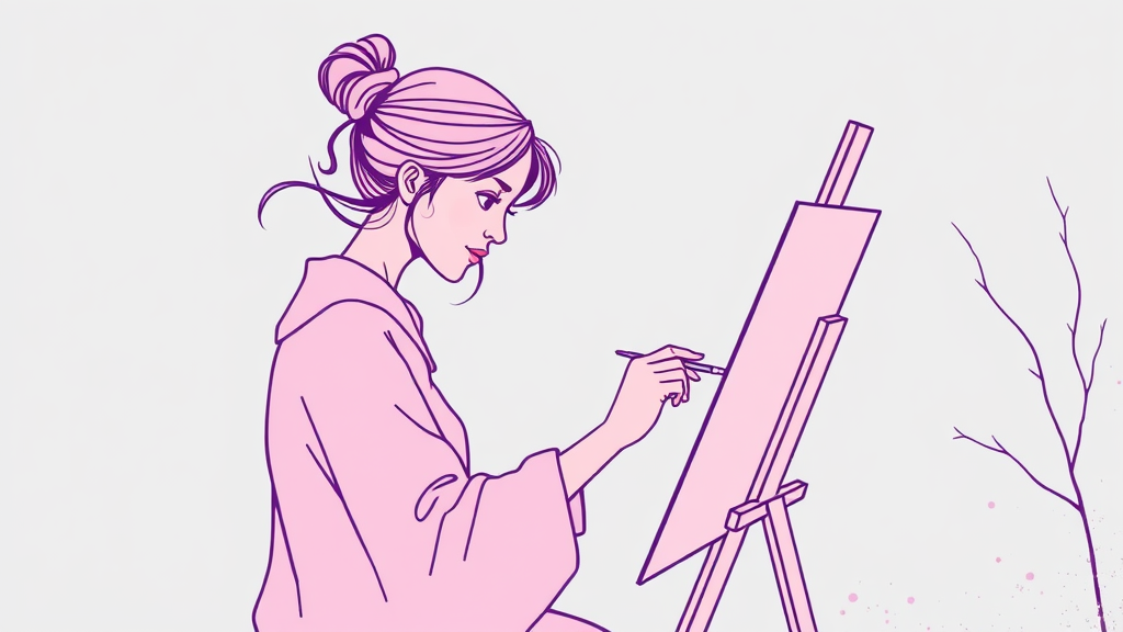 Flat illustration, line art, various Minimalist styles, a female artist immersed in painting, inspired by Tsutomu Nihei, featuring a dominant purple line with soft pink highlights, set against a rustic winter color palette background, version 5.2, incorporating abstract elements and subtle texture for a dynamic yet serene composition.