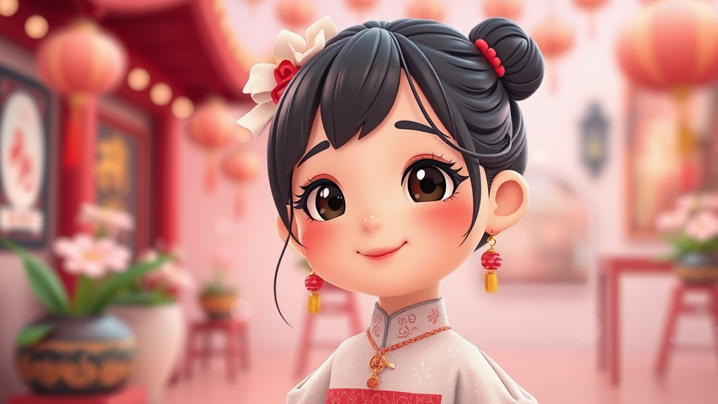 Flat illustration of a charming girl, reminiscent of a Chinese idol, captured in a close-up 3D perspective. The scene features a tiny, cute aesthetic with a subtle depth of field and soft bokeh effect. Hyper-detailed and playful, the composition adheres to the golden ratio. The full-length view offers a unique POV, with cartoon-like elements creating a cozy wallpaper atmosphere. The palette is dominated by pastel colors, infusing the illustration with warmth and whimsy.