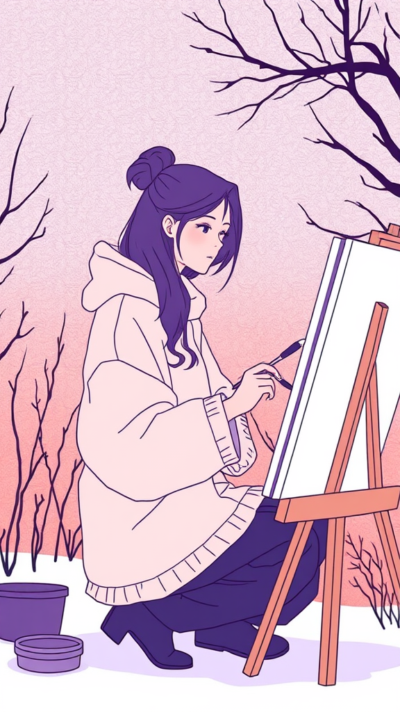 Flat illustration of a female artist painting in a minimalistic style, influenced by Tsutomu Nihei, featuring line art with a purple emphasis and pink highlights against a backdrop of rustic winter colors.