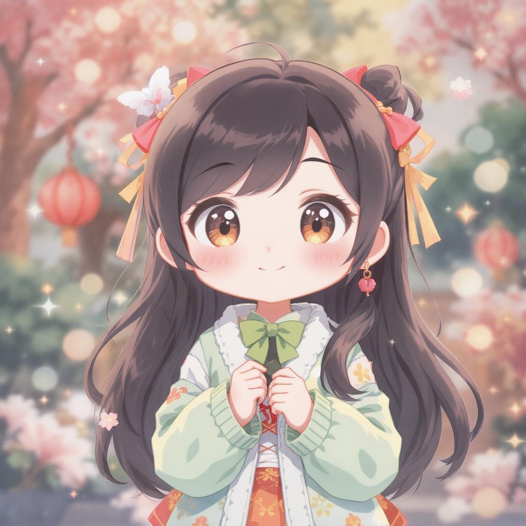 Flat illustration of an adorable Chinese idol girl, featuring a close-up with 3D elements, tiny and cute with a depth of field and bokeh effect, hyper-detailed and playful, following the golden ratio composition. The full-length view is from a POV angle, depicted in a cartoon style suitable for a cozy wallpaper. Incorporates pastel colors for a warm and inviting look.