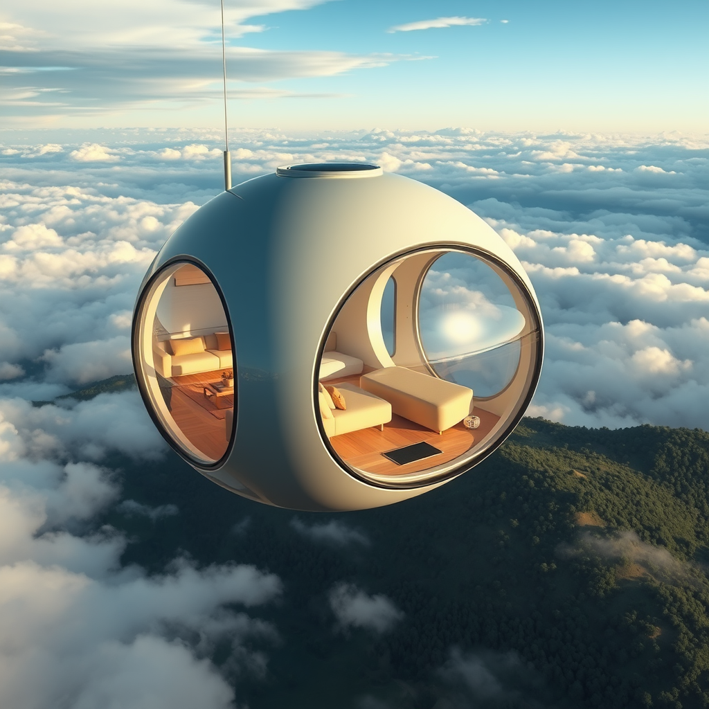Floating amidst the clouds, the capsule house hovers gracefully above the ground, its sleek, aerodynamic shape glistening in the sunlight. Suspended by invisible forces, the structure subtly sways with the gentle breeze, offering panoramic views of the world below through large, transparent walls. Its compact yet luxurious interior is a harmonious blend of futuristic technology and cozy, sustainable design. From this aerial vantage point, the inhabitants live in serene detachment, surrounded by the whispers of the wind and the expansive sky.