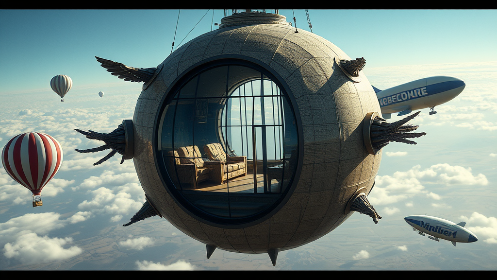Floating capsule house suspended above the earth, featuring an awe-inspiring entrance with expansive glass windows, high-resolution art, resembling a scene from a cinematic epic with intricate details. Influenced by Fenghua Zhong's style, the structure exudes a surreal aura with elements of distortion, such as blurry, fuzzy textures and unusual appendages including extra arms and fingers. The design incorporates wings and casts dramatic shadows, reminiscent of ancient Egyptian pyramids and statues. Accompanying the scene are two balloons hovering gently nearby, alongside a massive blimp, adding an element of whimsical contrast to the dreamlike landscape.