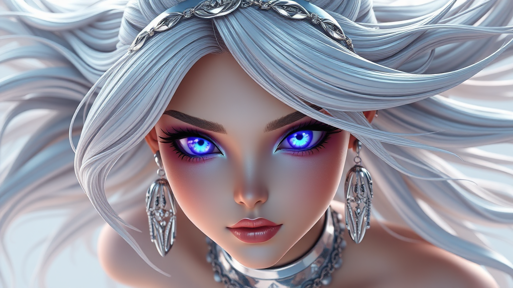 Floating dynamic figure with flowing hair adorned in metallic silver accessories, featuring luminous blue-purple gradient eyes. Rendered in high resolution with 3D art style reminiscent of Unreal Engine 5, emphasizing clear lines and well-defined facial features, the glowing eyes stand out as a focal point.