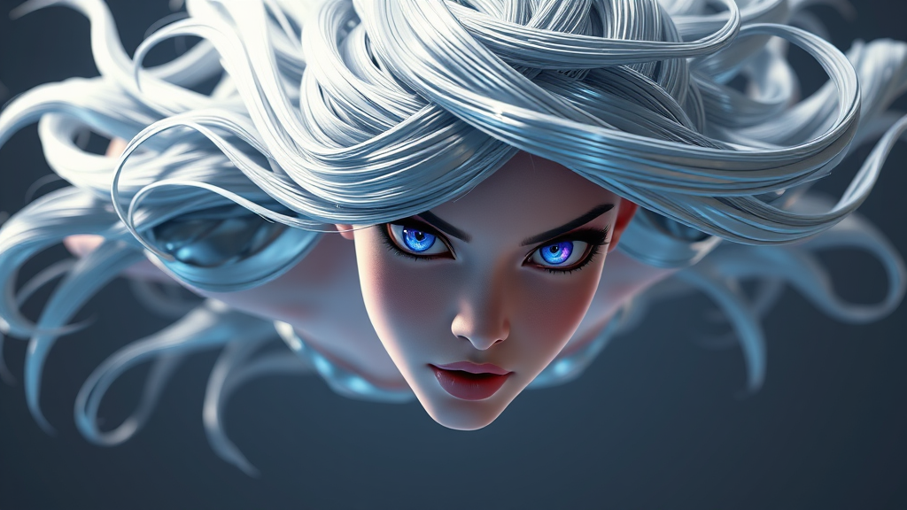 floating figure, dynamic perspective, flowing hair, metallic silver accents, luminescent eyes, high-resolution 3D artwork, rendered in Unreal Engine 5 style, sharp outlines, well-defined facial features, captivating eyes with a blue-purple gradient.