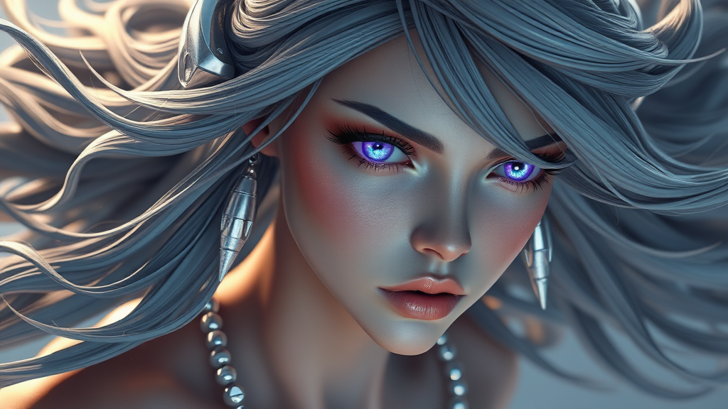 Floating figure with dynamic angles, cascading hair adorned with metallic silver accessories; their glowing, blue-purple gradient eyes convey intensity. The scene is crafted in high resolution, embodying the essence of 3D art reminiscent of Unreal Engine 5's stunning clarity. The figure's face is perfectly defined, with striking facial features and captivating eyes, enhanced by clear lines and a vivid sense of realism.