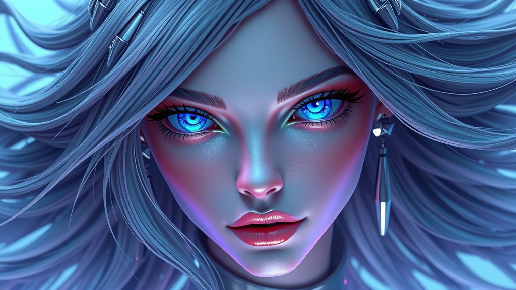 Floating figure with dynamic angles, featuring flowing hair adorned with metallic silver accessories. The eyes are glowing with a mesmerizing blue-purple gradient, crafted in high resolution with clear lines and striking facial features. The art style is reminiscent of 3D rendering, capturing the essence of Unreal Engine 5, with an ethereal and technologically advanced aesthetic.
