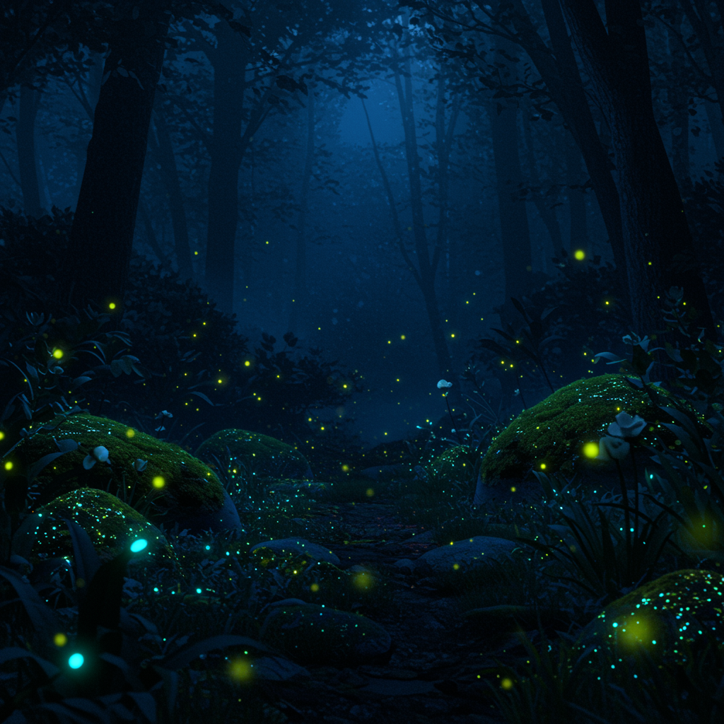 Floating gently through a mystical forest, aglow with the soft light of fireflies, where luminescent plants and moss-covered stones create an enchanting scene. Shadowy trees loom under the deep indigo night sky, bathed in shimmering dew and caressed by delicate moonbeams. The air is alive with an ethereal aura, evoking an otherworldly wonder.