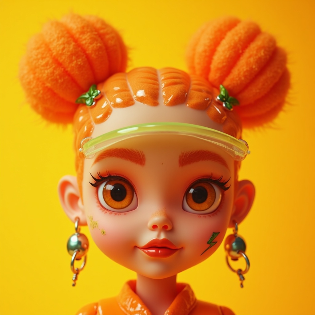 A hyper-stylized 3D floating head of a tangy-punk vinyl doll emerges. Face and skin gleam with warm honey-tone plastic-gloss vinyl, creating a strong mirror bounce on temples and chin. The eyes are captivating, with fizzy-orange irises and citrus-slice pupils, accented by sharp lime-green wing liner. Hair bursts into life with twin giant tangerine-fuzz puffs, while a chartreuse shaved undercut discreetly peeks through. Lips gleam in juicy blood-orange lacquer, exhibiting an ultra-wet reflection. Accessories include a clear acrylic visor band adorned with chrome citrus-leaf clips and triple neon-green resin hoops. A pixel-art thunder tattoo elegantly rests beneath the right eye. Set against a vibrant gradient of mango-yellow to pastel-peach, the scene is illuminated by bright beauty lighting with warm key tones, highlighting crisp hotspots on glossy skin. The camera, framed in an 85 mm portrait crop, captures the plush fuzz of the hair, the vinyl-shine of the skin, the glass-like sheen of the lips, and the mesmerizing resin hoops, all exuding the style of an acid-fruit punk doll.
