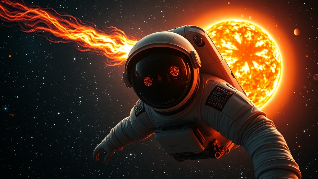 View this AI-generated image featuring an astronaut floating in the vastness of space mesmerized by the spectacle of a coronal mass ejection erupting from the sun casting brilliant plumes of solar material against a backdrop of shimmering stars the cosmos unfolds in cinematic clarity with vibrant hu