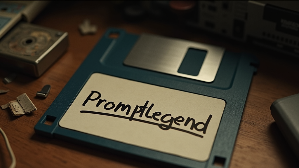 A vintage floppy disk with "PromptLegend" scrawled in bold marker, set against a backdrop of a cluttered, nostalgic 90s desk; softened lighting casts gentle shadows, giving the scene a warm, reminiscent ambiance --style raw --s 75 --ar 16:9 --v 6.0