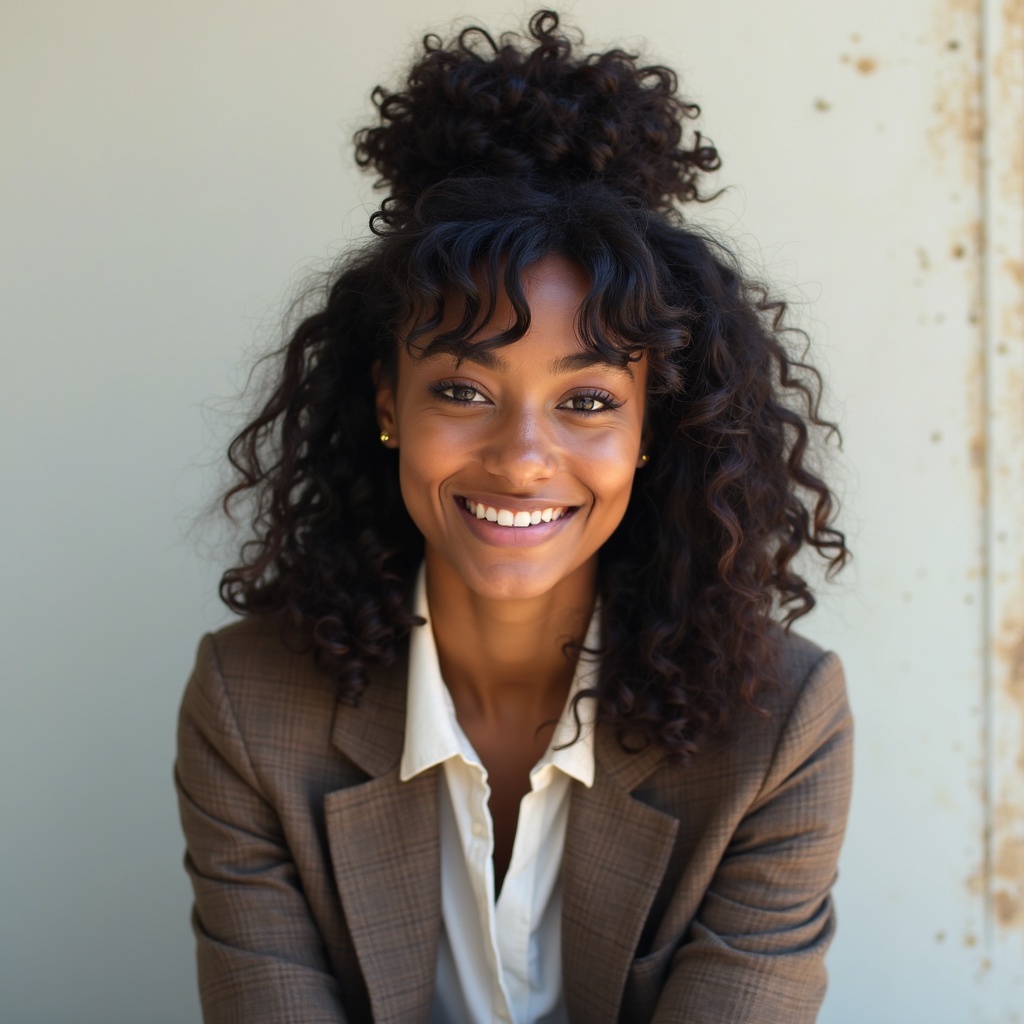 FlorencePugh3 Half-Up Half-Down: black hair This versatile hairstyle elegantly merges both pulled-back and flowing styles. Gather the top half of your hair, securing it with an attractive clip or tie, while the lower half cascades freely. Perfect for school or social engagements, it's a striking yet practical option. The Sitting/Leaning Pose: Choose an aesthetically pleasing spot like a bench, staircase, or wall to sit or lean against. Settle into a relaxed pose, cross your legs, or casually lean back, allowing your natural charm to shine through in the photo. The pose conveys an informal, effortless aura. Casual-Chic: Melding comfort with a hint of sophistication, this style emphasizes quality basics such as well-fitted jeans, a crisp white button-down, and a tailored blazer. Accentuate with standout accessories or trendy sneakers to achieve a polished yet laid-back look ideal for everyday. Venice Beach: Experience the vibrant, eclectic vibe of Venice Beach, offering diverse photo backdrops. Capture the vivid graffiti along the boardwalk, set against palm trees, or take pictures on the sandy shore, invigorated by the ocean breeze. Ultra high resolution, real shadow, captured with Canon EOS R6, 135mm, 1/1250s, f/2.8, ISO 400. Features a smiling male with curly hair and an Afro with bangs. Embrace the unique aspects while maintaining the essence.