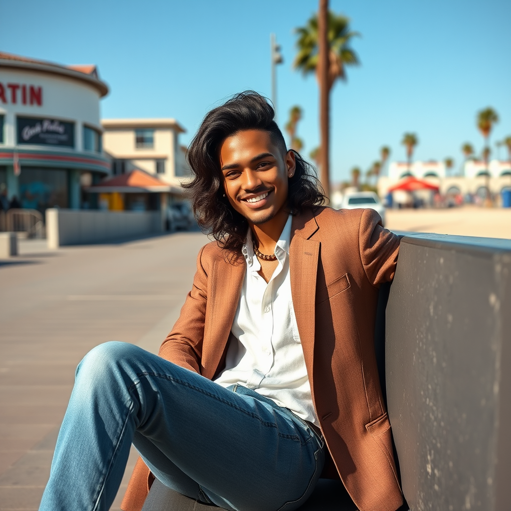 FlorencePugh3 Half-Up Half-Down: black hair This versatile hairstyle showcases both your hair down and pulled back. Gather the top half of your hair and secure it with a cute accessory, letting the rest flow freely. Perfect for school or social events. The Sitting/Leaning Pose: Choose an appealing spot to sit or lean, like a bench, staircase, or wall. Relax, cross your legs, or lean casually to exude natural charm. This adds a casual, effortless vibe to photos. Casual-Chic: Combine comfort with sophistication using high-quality basics like well-fitted jeans, a white shirt, and a tailored blazer. Pair with statement accessories or trendy sneakers for a stylish, relaxed look for everyday posts. Venice Beach: Known for its vibrant atmosphere, Venice Beach offers unique photo opportunities. Capture colorful graffiti on the Boardwalk, pose by palm trees, or snap shots on the beach with the ocean breeze. Ultra high-res, real shadow, photographed by Canon EOS R6, 135mm lens, 1/1250s shutter speed, f/2.8 aperture, ISO 400, natural smile, male with curly afro and bangs, hat optional.