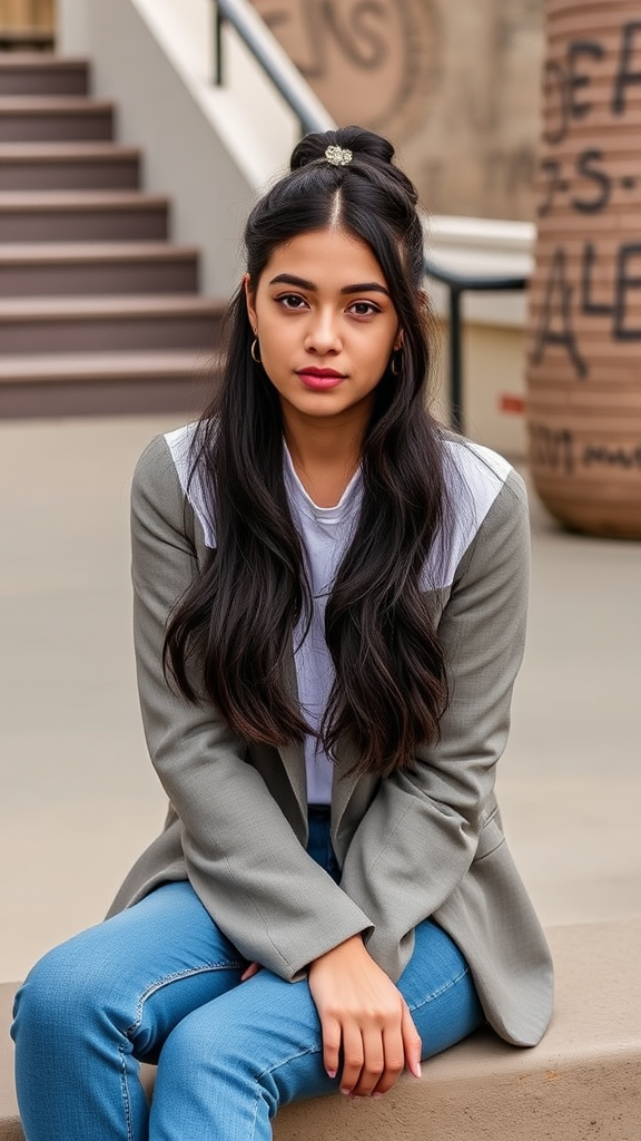 FlorencePugh3 Half-Up Half-Down: black hair This versatile hairstyle allows you to display both your hair down and pulled back. Simply gather the top portion of your hair and secure it with a charming hair tie or clip, leaving the rest of your hair flowing freely. It's an elegant and practical choice for school or social gatherings The Sitting/Leaning Pose: Choose an attractive spot to sit or lean against, such as a bench, staircase, or wall. Relax in the pose, cross your legs, or lean casually, letting the camera capture your natural appeal. This pose adds an effortless and laid-back vibe to your photos. Casual-Chic: Combining comfort with sophistication, consider high-quality basics like well-fitted jeans, a white button-up shirt, and a tailored blazer. Pair these classics with statement accessories or trendy sneakers for a stylish yet relaxed look perfect for everyday snapshots. Venice Beach: Famed for its vibrant and eclectic atmosphere, Venice Beach offers unique photo opportunities. Capture the colorful graffiti walls along the Venice Boardwalk, pose under the palm trees, or take photos on the sandy beach while enjoying the ocean breeze, ultra high resolution, real shadow, photographed using Canon EOS R6, 135mm, 1/1250s, f/2.8, ISO 400, men, male, smile, curly hair, afro, bangs, hats, child, kid, young smiling.