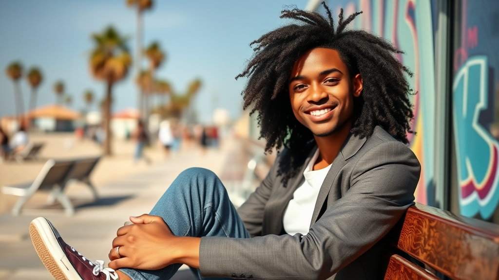 FlorencePugh3 Half-Up Half-Down hairstyle featuring flowing black hair: This versatile look showcases both elegance and practicality. Gather the top section and secure with an elegant accessory, letting the rest cascade freely. Ideal for both school and social occasions. Sitting/Leaning Pose at a visually appealing location like a bench or wall, embracing a relaxed vibe. Cross your legs or lean naturally, allowing the camera to capture an effortless charm. Casual-Chic style: Combine comfort and sophistication with high-quality basics like fitted jeans, a white shirt, and a tailored blazer. Add statement accessories or trendy sneakers for a stylish everyday look. Venice Beach: Capture the vibrant atmosphere with colorful graffiti along the Boardwalk, palm tree backdrops, or sandy beach shots with an ocean breeze. Ultra high res, real shadow, shot with Canon EOS R6, 135mm, 1/1250s, f/2.8, ISO 400. Features a smiling male with curly afro and bangs, adding a touch of youthfulness and joy.
