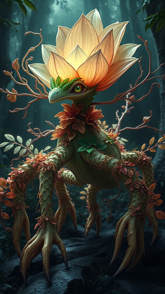 Florent is an enchanting fusion of animal and plant, its body adorned with a tapestry of soft, shimmering leaves and delicate branches that skitter over a layer of translucent skin. The Florent boasts four elongated limbs cloaked in vibrant foliage, enabling nimble movements across the forest floor. Each limb terminates in serrated claws, perfect for seizing unsuspecting prey. Its majestic head blooms like an exotic flower, crowned with hypnotic tendrils that emit a soft, bioluminescent glow, revealing the world even in the darkest of nights. Within this floral visage, two expansive eyes capture every shadow and glimmer. The Florent possesses an acute sense of smell, with a prominent, petal-like snout that discerns the faintest of scents, painting a sensory map of its environment. Although the Florent's speed wanes over great distances, it gracefully drifts upon the wind, thanks to its leaf-like appendages. Moreover, it anchors itself with sophisticated root systems, drawing sustenance from the nourishing earth and thriving silently in its symbiotic habitat.