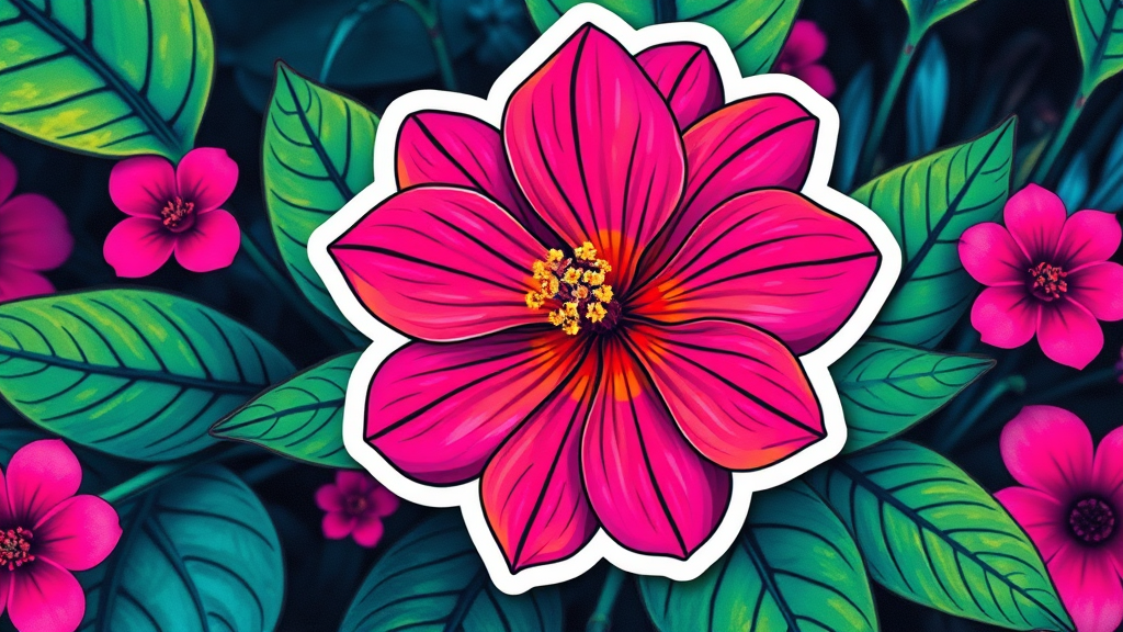 Flower sticker, tropical, fluorescent, Frida Kahlo influence, RGB color palette with vivid saturation, focus on vibrant contrasts and bold designs, emphasizing lush, exotic plants and vivid floral imagery with a touch of surrealism, omitting drop shadows, maintaining clarity and sharpness, enhanced detail and visual depth, artistic inspiration from tropical flora and cultural motifs.