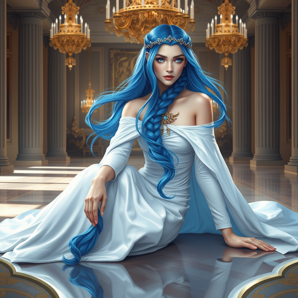 flowing half-tied braid of long azure blue hair, elven tiara circlet and ornate amulet, striking sapphire eyes, subtle allure, mouth closed, intricately designed off-shoulder white gown with long sleeves, elegant white cloak, slender fingers on both hands, luminous pale skin, delicate waistline, exquisitely detailed gold leaf circlet, shapely legs, poised in high-heeled shoes, gracefully reclined on the polished floor, surrounded by majestic chandeliers and grand hall columns, a masterpiece of art, hyperrealism, photorealistic quality, detailed features and resplendent attire, harmonious blend of painting and illustration elements, perfect form with no distortions or imperfections, full body portrayal immersed in elegance.