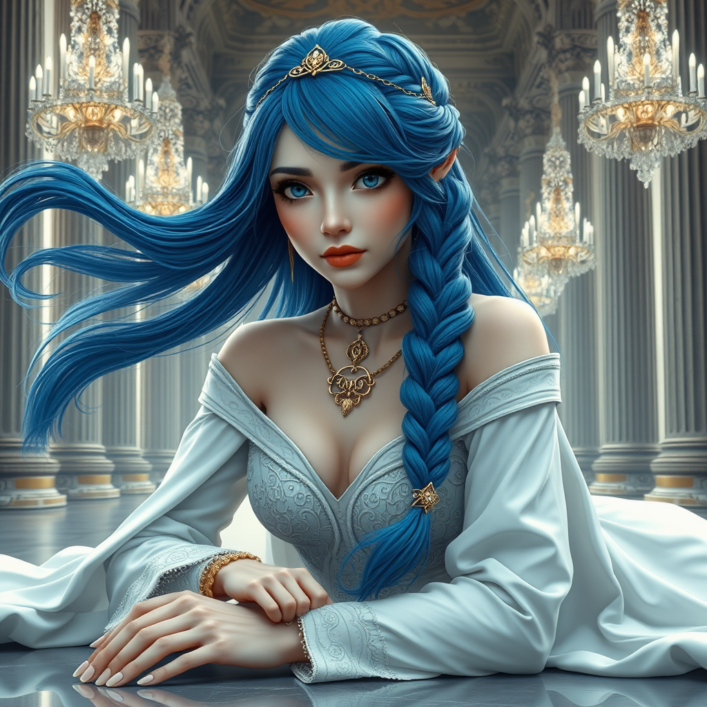Flowing half-tied braid of long blue hair, elven tiara circlet bracelet amulet, detailed face and eyes, photorealistic, hyperrealism, blue eyes, b-cup chest, mouth gently closed, intricate off-shoulder white gown with long sleeves, elegant white cloak, five-fingered hands, pale milky complexion, slender waist, detailed intricate gold leaf circlet, gracefully strong thighs, high heels, reclining on the floor, shimmering chandeliers, vast hall with towering columns, masterpiece, vivid 3D illustration, painting with artistic flair, refined elegance, full composition showcasing harmonious balance, focus on beauty and grace, with delicate features and sleek form.
