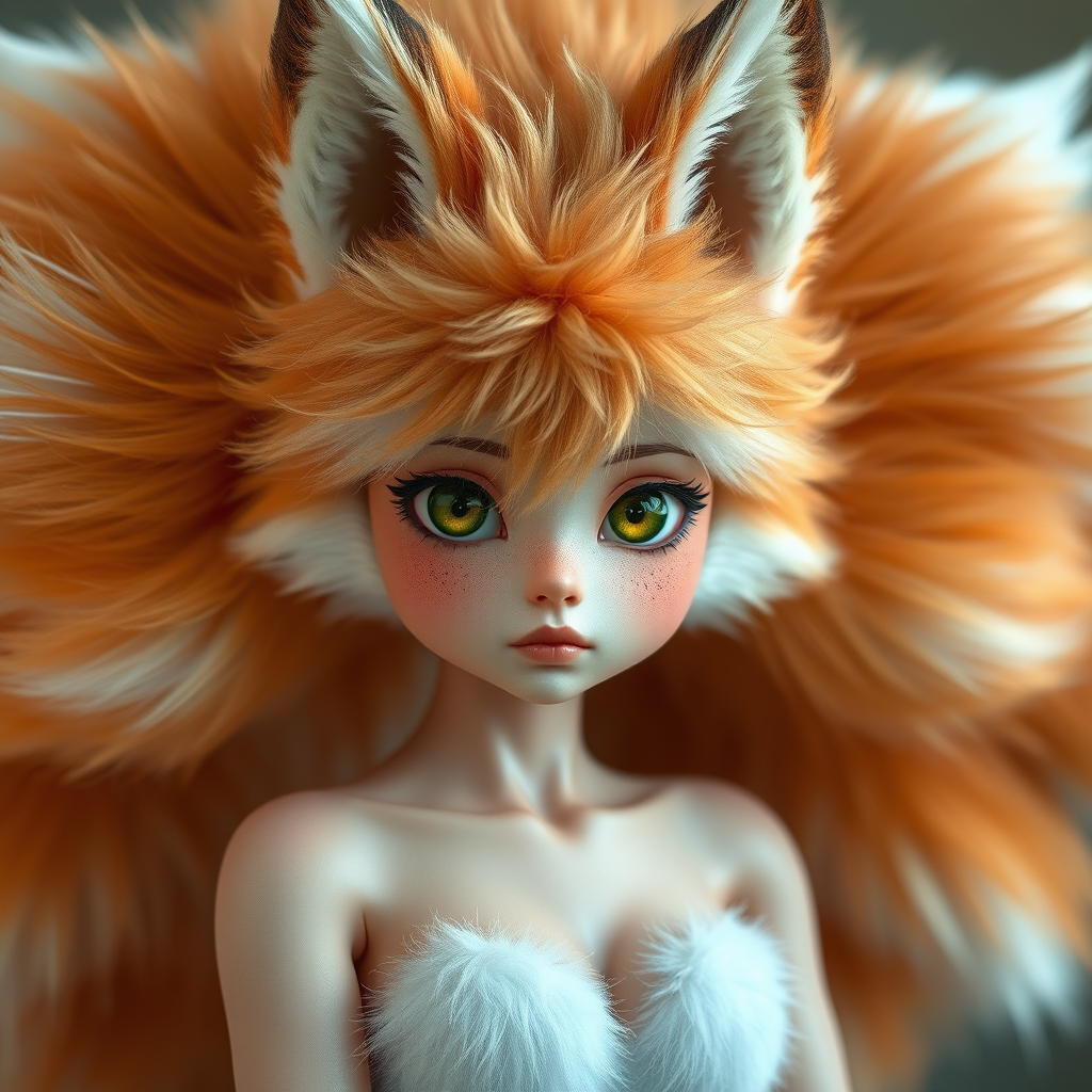 Fluffy nine-tailed fox girl, hyper-realistic, professional photography, 8k resolution, soft natural lighting, CGI-inspired, 3D aesthetics, doll-like features, cartoon and anime fusion, illustration and digital painting elements, realistic texture with hints of artistic style, skin with minor imperfections like spots and blemishes, unique and creative anatomy, capturing the essence of fantasy and reality.