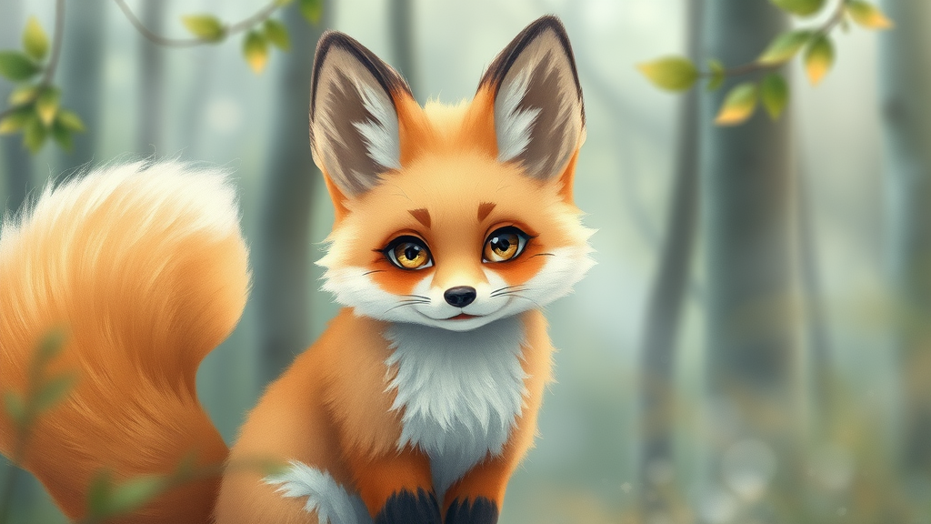 Fluffy nine-tailed fox girl in a serene, misty forest setting, capturing her coy expression with hyper-realistic 8k resolution photography, under soft, natural morning light, with subtle tree branches and leaves reflected in her sparkling eyes, softened by a gentle focus blur, amidst a tranquil atmosphere reminiscent of a Japanese watercolor painting.