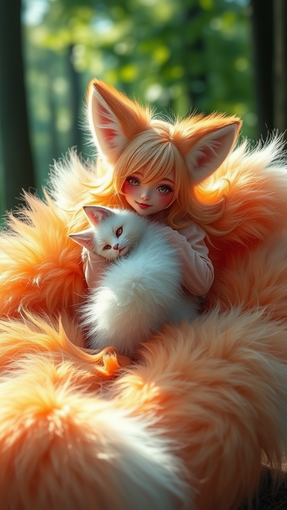Fluffy nine-tailed fox girl inspired by Wlop and Guweiz, hyper-realistic, professional photography, 8k resolution, gentle natural lighting, poised for an affectionate moment, vibrant tails gracefully fanned out, warm eyes and a playful smile, delicate blush on cheeks, soft breeze tousling silken fur, ethereal atmosphere, undeniable allure, poised in a serene, enchanting forest setting, the epitome of mythical grace and charm.