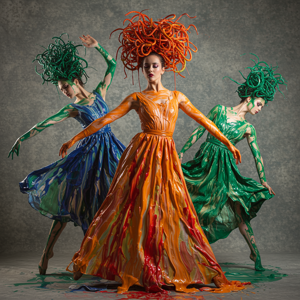 FluidArt-inspired photoshoot featuring multiple dancers, each adorned in tri-color, long-sleeved Victorian-style dresses crafted from thick, flowing paint. The rich cords of paint cascade dramatically, reminiscent of Medusa's hair, and the dancers strike alluring, transformative poses. Their bodies appear to metamorphose, with appendages and legs seamlessly merging into streams of dripping paint. Extra limbs add to the surreal visual, creating a sense of dynamic movement and fluidity. This wide-zoom shot captures the dancers' expressive poses and the vivid, paint-textured ensemble, evoking a dream-like state where art and human form blend seamlessly.