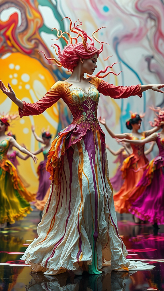 FluidArt-inspired scene, human bodies enveloped in vibrant paint, dancers striking expressive poses, capturing the essence of motion and grace. The composition features an array of tri-color schemes, with ornate, long-sleeved Victorian dresses seemingly woven from cascading layers of rich, thick paint. These garments drip and flow, transforming the silhouette into a mesmerizing display of art and life. Each figure's hair morphs into Medusa-like tendrils of paint, adding to their captivating allure. The setting showcases a metamorphosis, where appendages and limbs transform into streams of thick, dripping paint, blending seamlessly with the surrounding environment. Multiple figures populate the scene, each with additional arms and legs, suggesting dynamic movement and interconnectedness. As the camera captures a wide-zoom perspective, the transformation of bodies into sculptural paint forms creates a stunning visual narrative. Distorted and surreal elements evoke a sense of mystery and wonder.