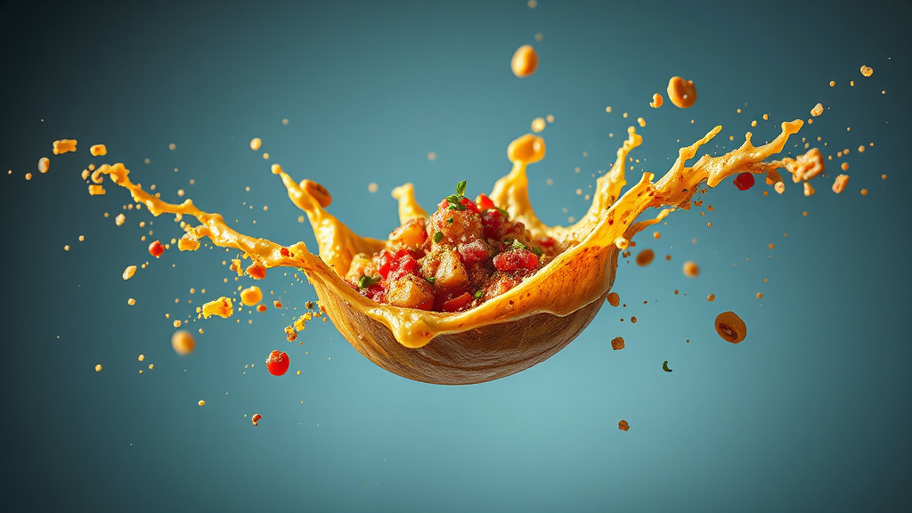 Flying food photography with dynamic splashes of toppings and seasonings as the main subject, captured using high-speed photography, photorealistic, surrealism style, trending minimalist background. Five ad posters with pro-grade color grading, studio lighting, and rim lights, shot using an EOS-1D X Mark III, inspired by 500px and Behance concept art, with small creative modifications to enhance the core concept.