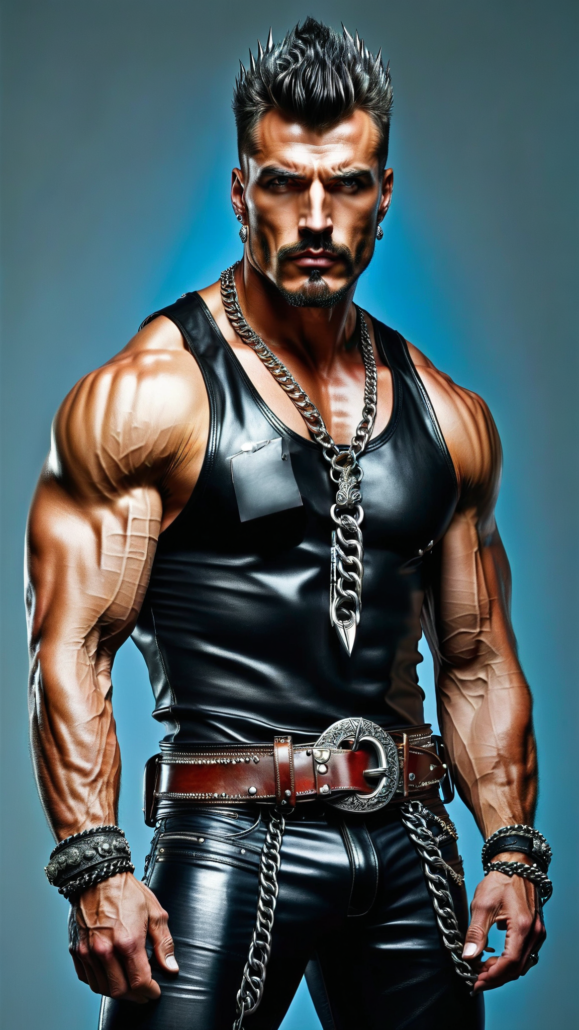 Fold is tall, strong, muscular, brawny, wide shouldered, big muscled. Caucasian male with strong brow and jaw, dark eyes. His head is shaved except for one narrow spiky strip of black hair down the center of his head, a really thin Mohawk. He has a thin black horseshoe mustache. He usually wears a tight bright red tank top that stretches across his massive chest. Thick silver chain wrapped around his neck, silver chains above his biceps, and a dangling silver dagger earring in one ear. Black leather bracers on his wrists. Black acid-washed jeans on his muscular legs with a black studded leather belt, and black leather engineer boots.