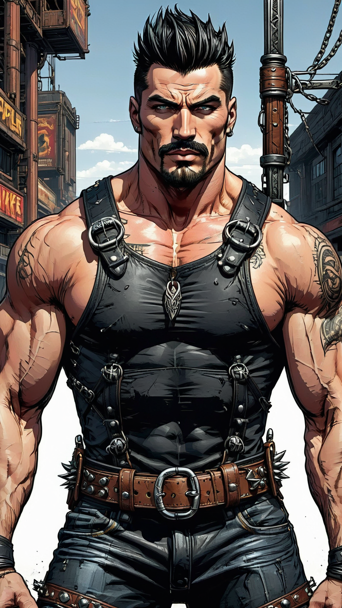 Fold is tall, strong, muscular, brawny, wide shouldered, big muscled. Caucasian male with strong brow and jaw, dark eyes. His head is shaved except for one narrow spiky strip of black hair down the center of his head, a really thin Mohawk. He has a thin black horseshoe mustache. He usually wears a tight bright red tank top that stretches across his massive chest. Thick silver chain wrapped around his neck, silver chains above his biceps, and a dangling silver dagger earring in one ear. Black leather bracers on his wrists. Black acid-washed jeans on his muscular legs with a black studded leather belt, and black leather engineer boots.