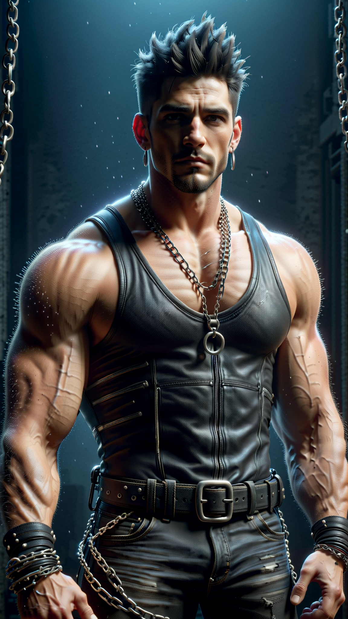 Fold is tall, strong, muscular, brawny, wide shouldered, big muscled. Caucasian male with strong brow and jaw, dark eyes. His head is shaved except for one narrow spiky strip of black hair down the center of his head, a really thin Mohawk. He has a thin black horseshoe mustache. He usually wears a tight bright red tank top that stretches across his massive chest. Thick silver chain wrapped around his neck, silver chains above his biceps, and a dangling silver dagger earring in one ear. Black leather bracers on his wrists. Black acid-washed jeans on his muscular legs with a black studded leather belt, and black leather engineer boots.