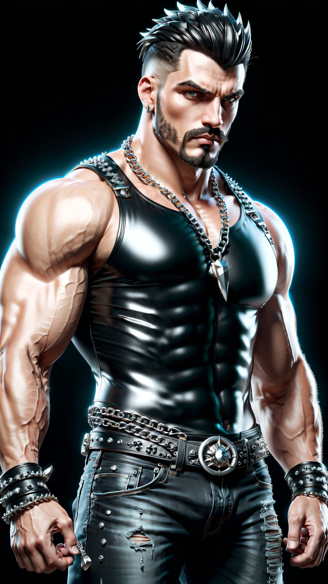 Fold is tall, strong, muscular, brawny, wide shouldered, big muscled. Caucasian male with strong brow and jaw, dark eyes. His head is shaved except for one narrow spiky strip of black hair down the center of his head, a really thin Mohawk. He has a thin black horseshoe mustache. He usually wears a tight bright red tank top that stretches across his massive chest. Thick silver chain wrapped around his neck, silver chains above his biceps, and a dangling silver dagger earring in one ear. Black leather bracers on his wrists. Black acid-washed jeans on his muscular legs with a black studded leather belt, and black leather engineer boots.