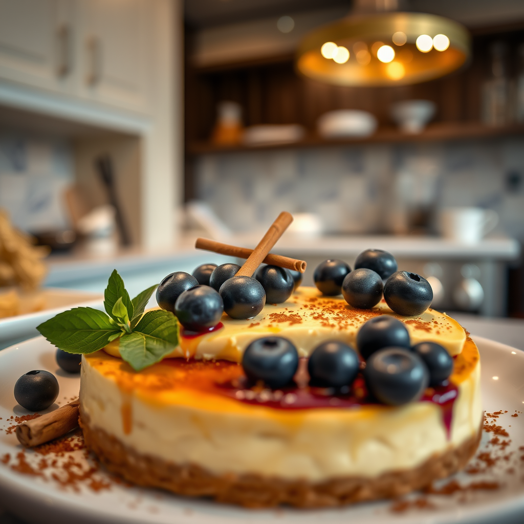 Food photography featuring a decadent cheesecake adorned with fresh blueberries and a hint of cinnamon, set against the backdrop of an opulent Michelin-star kitchen. Capture the scene with a shallow depth of field, highlighting the ultra-detailed textures and ingredients. Use uplighting to accentuate natural features, creating a sophisticated and inviting atmosphere.