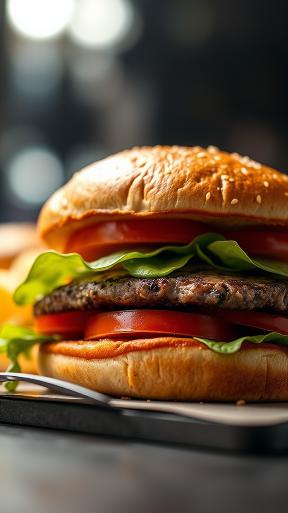 Food Photography of a burger, Studio Lighting, NIKON D300, 50mm f/1.4 at 50mm, ISO 200, 1/200, f/3.2, kaleidoscopic effect, Cheiron Crush style, Lithography influence, close-up portrait, highly realistic, Sketchfab-inspired, sharp focus, intricate and detailed, professional advertising quality, low angle, masterful depth of field, hyper-realistic, intricate detail, masterpiece level work, low saturation, abstract elements minimized, single clear subject, natural proportions, seamless composition, focused and clear, vibrant but accurate colors.