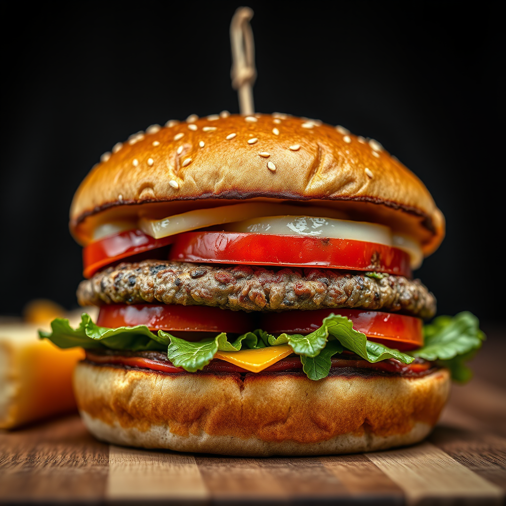 Food Photography of a gourmet burger, Studio Lighting, captured with a NIKON D300 + 50mm f/1.4 lens at 50mm, ISO 200, 1/200, f/3.2. A kaleidoscopic and Cheiron Crush effect reminiscent of Lithography, featuring a close-up, sharp, and detailed composition akin to professional advertising. This masterpiece captures the intricate and realistic details with hyper-realistic emphasis. It employs a low angle and depth of field to highlight the burger's textures, creating a dynamic and engaging visual experience. The scene is free from blurriness, abstraction, or any disfigurements, thereby maintaining a realistic and lifelike appearance. The vibrant colors, precise framing, and flawless execution emphasize the artistry of food photography at its finest.