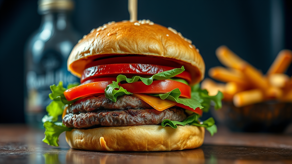 Food Photography of a gourmet burger: Studio Lighting: NIKON D300 with a 50mm f/1.4 lens at 50mm, ISO 200, 1/200, f/3.2, kaleidoscopic effect, vibrant Cheiron Crush style, Lithographic texture, close-up portrait, Sketchfab inspired sharpness, sprite-like detail, laser lighting, hyper-realistic intricate detail, finely detailed, premium advertising quality, professional food photography, highly detailed and realistic, presented from a low angle with a captivating depth of field, a masterpiece of culinary visuals.