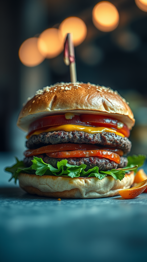 Food Photography of a gourmet burger with studio lighting, captured with a NIKON D300 and a 50mm f/1.4 lens at 50mm, ISO 200, 1/200, f/3.2. Featuring kaleidoscopic textures and exquisite detail reminiscent of lithography, the composition is a close-up portrait style akin to a Sketchfab model, showcasing sharpness and hyper-realistic intricacies. This advertising masterpiece displays professional work with a realistic low-angle perspective, emphasizing depth of field. The imagery steers clear of abstraction or distortion, maintaining focus on vibrant and true-to-life colors while avoiding artistic flaws or anomalies such as poor anatomy, disfigurement, or inappropriate cropping.