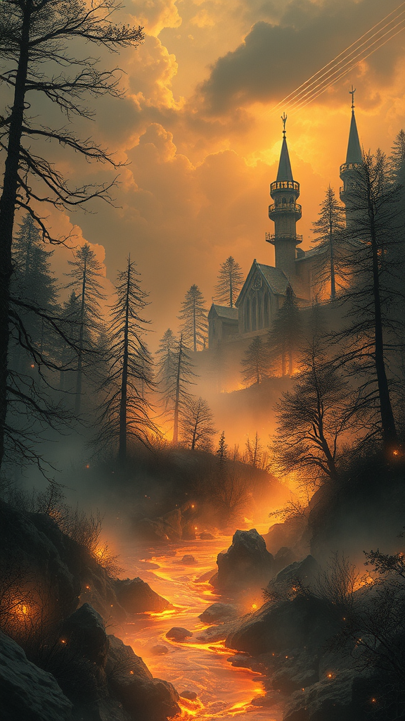 forest fog witches high contrast photo swirling lights deformed sketch water industrial gold crystals jewels gems mystical fantasy cyberpunk steampunk detailed concept art alice in wonderland vibrant clouds tempest contemporary architecture ancient architecture ivory marble utopia awe-inspiring 4k masterpiece organic patina hdr octane render