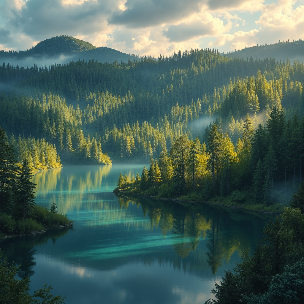 Forest hill lake masterpiece best-quality intricate CG unity 8k wallpaper landscape texture highly-detailed inspired by Mark Lague painting concept art 8k uhd dslr film grain magnificent maximum-details surreal vibrant fantasy illustration enchanting captivating scene sophisticated polished serene natural wonder breathtaking tranquility subtle comic touch unique distortion ethereal beauty harmonious blend.