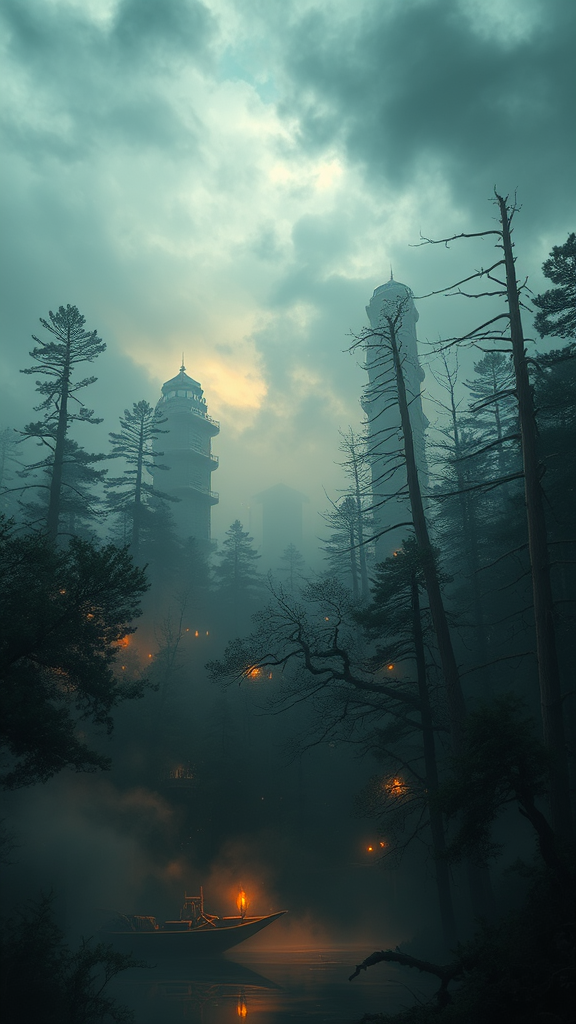 Forest, shrouded in mist, witches weaving enchantments, high contrast photograph capturing sand swirling in ethereal lights, deformed sketches blending reality and imagination, water reflections mingling with industrial landscapes, shimmering gold, crystals, and jewelry glinting like mystical gems, a fantastical journey through cyberpunk and steampunk worlds, detailed concept art reminiscent of Alice in Wonderland, stormy skies with loud clouds over modern and ancient architecture, ivory and marble structures amidst paradise-like settings, mind-blowing vistas in 4k brilliance, an organic fusion of rust and nature, octane-rendered spectacle of contrasts.