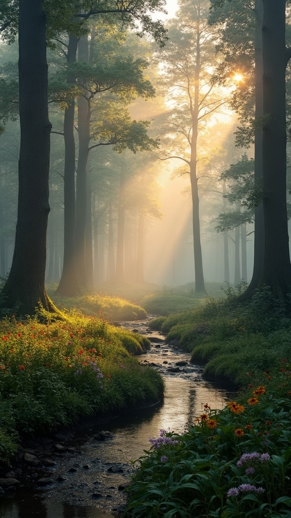 A mist-covered forest at dawn, sunlight peeking through towering trees, casting long shadows on the forest floor, soft edges blurred by a gentle depth of field, the sound of rustling leaves and distant bird calls enhancing the atmosphere, a serene stream winding through, reflecting the golden light, occasional bursts of vibrant wildflowers adding splashes of color.