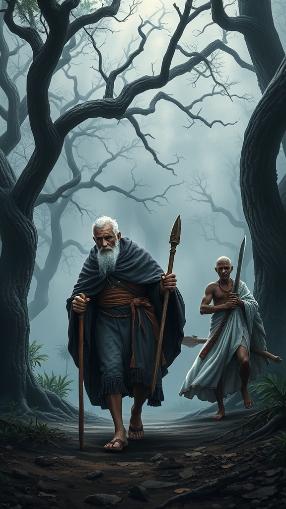 In the heart of the Kelunwa Forest, where the ancient, gnarled trees stretch their skeletal branches toward a sky shrouded in swirling, silver mist, an unusual group treads quietly. The aged King, weary and wise, strides with purpose, his sunken eyes scanning the shifting shadows. His once majestic royal cloak, now faded to a muted purple, flutters gently as he walks, and in his steady hand, he grips a worn staff etched with the stories of his ancestors. Beside him is Prince Chidi, exuding determination with his sharp jawline and unwavering gaze. Clad in a rugged leather tunic and a hunter’s cape, he grips the hilt of a ceremonial sword, ready for the unknown that lies ahead. The Chief Priest, a gaunt figure of mystery, follows closely, his flowing robes of white and red a stark contrast in the dim light. Adorned with beads and cowrie shells, his face is a canvas of sacred markings, barely visible in the murkiness of the forest. They edge closer to the heart of the scene, where the mouth of an ominous cave gapes like a monstrous maw, its depths shrouded in shadows and emitting a faint, pulsating red glow. The undergrowth rustles with unseen creatures, their glowing eyes like embers flickering in the darkness. As they approach, the atmosphere grows thick with anticipation, the air alive with the whispers of the past and the secrets the forest has guarded for centuries. All are aware of the weight of their task and the unknown challenges that await within the cave's shadowy embrace.