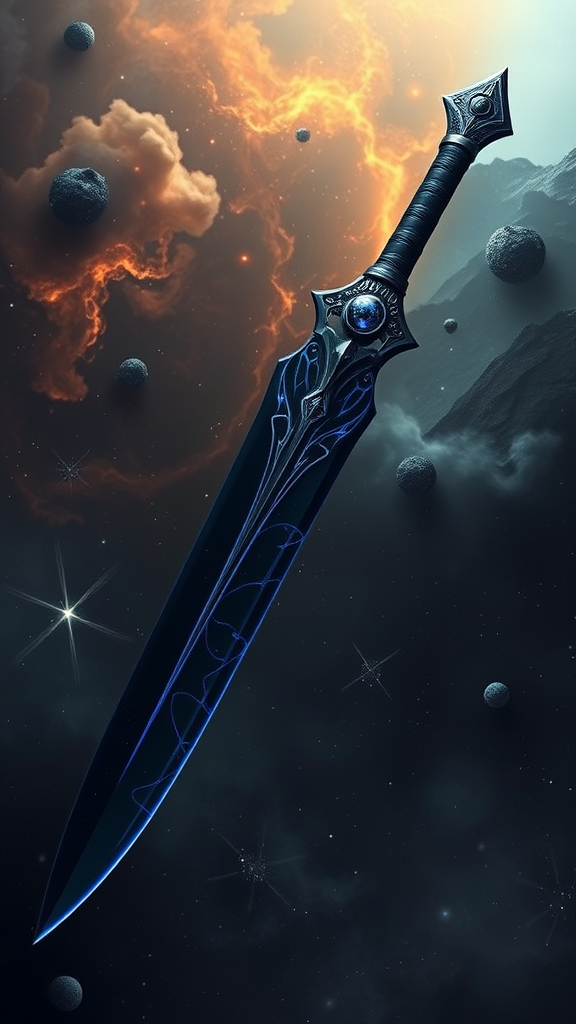 Forged from the depths of the universe, this mythical weapon harnesses the power to manipulate dark matter and conjure black holes. A seamless blend of futuristic technology and primordial sorcery, it boasts a sleek blade of shadowed obsidian, seeming to swallow light entirely, with vibrant indigo veins coursing through its core. Its hilt features intricate celestial designs, echoing the dance of dying galaxies, and cradles a levitating orb of dark energy that emits a mysterious gravitational pull. When summoned, the weapon warps the fabric of space, creating undulating distortions in reality, and with a single swing, it can open miniature black holes, devouring all in its trajectory. A formidable creation of cosmic supremacy, it commands awe and terror from the divine and mortal realms alike.