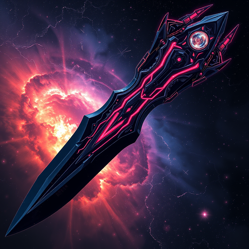 Forged from the very essence of the cosmos, the legendary weapon known as the Abyssal Shard wields the awe-inspiring power to command dark matter and summon voids of nothingness. This extraordinary fusion of arcane magic and advanced technology boasts a sleek, obsidian blade that drinks in surrounding light, accented by luminous crimson veins that pulse with cosmic energy. The hilt is intricately adorned with celestial motifs resembling nebulae in collapse, and at its heart hovers a mysterious core of dark energy, emitting a mesmerizing gravitational field. Once activated, the weapon warps reality, creating undulating distortions and with a mere swing, can rend the fabric of space itself, opening ephemeral singularities that devour all within reach. A supreme construct of annihilation and cosmic supremacy, it is a force feared by deities and mortals throughout the universe.