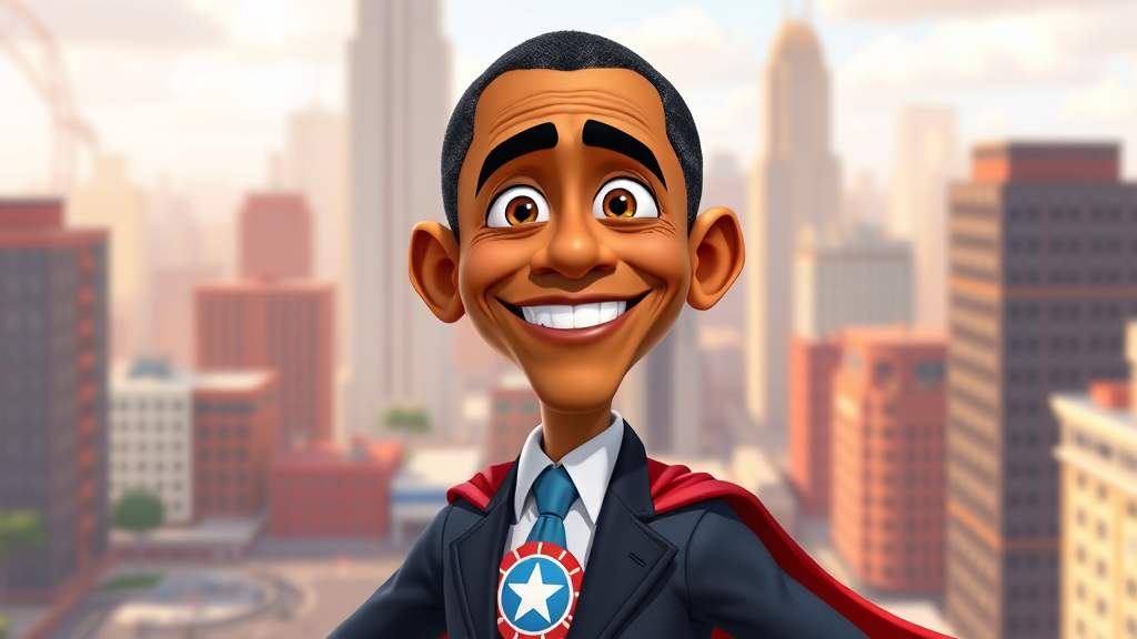 Former President Obama reimagined as a cheerful, animated Pixar character, exuding warmth and wisdom, with an approachable expression, a confident stance, and dressed in a stylized superhero suit that symbolizes hope and leadership, set against a vibrant backdrop of an inspiring, cartoonish cityscape.