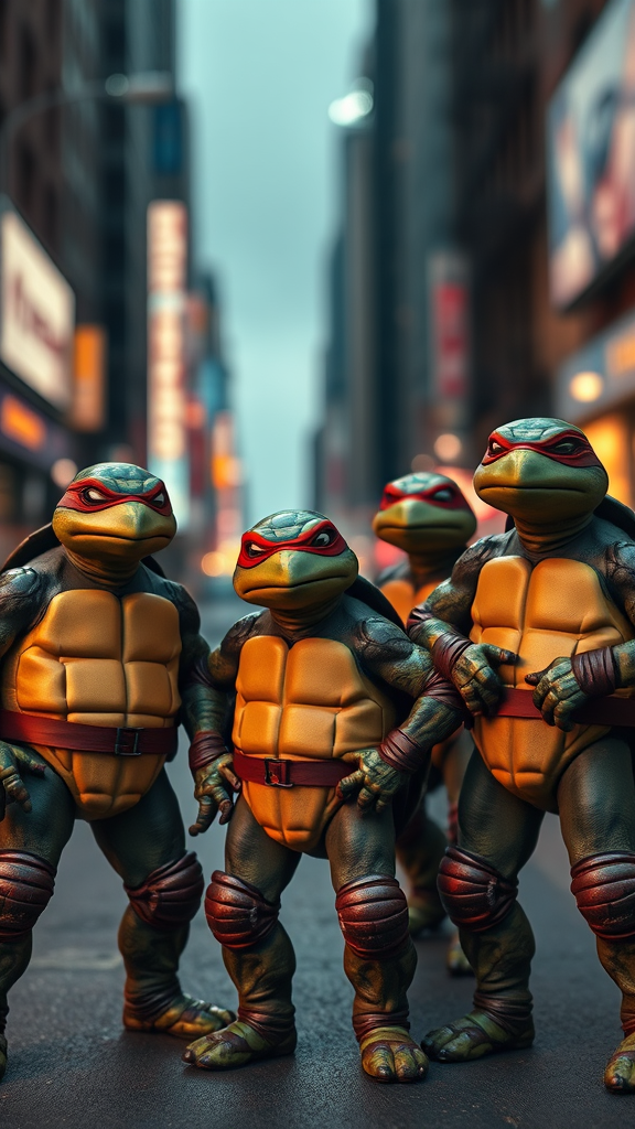 Four anthropomorphic turtles, reminiscent of Teenage Mutant Ninja Turtles, stand confidently in an urban setting, each displaying unique personality traits through their stances and expressions. The scene is captured in a hyper-realistic, ultra-detailed photograph, with the clarity and sharpness achieved through an 85mm lens at f4.6. The background features a mesmerizing bokeh of city lights, adding an artistic blur that contrasts sharply with the intricate details of the turtles’ features. The image combines elements of surrealism and kitsch, seamlessly blending into an urban landscape reminiscent of an ultra-unreal engine scenario. The turtles’ vibrant colors and textured skin stand out against the muted, bustling urban surroundings, creating a dynamic and engaging scene that feels alive and full of unexpected charm.