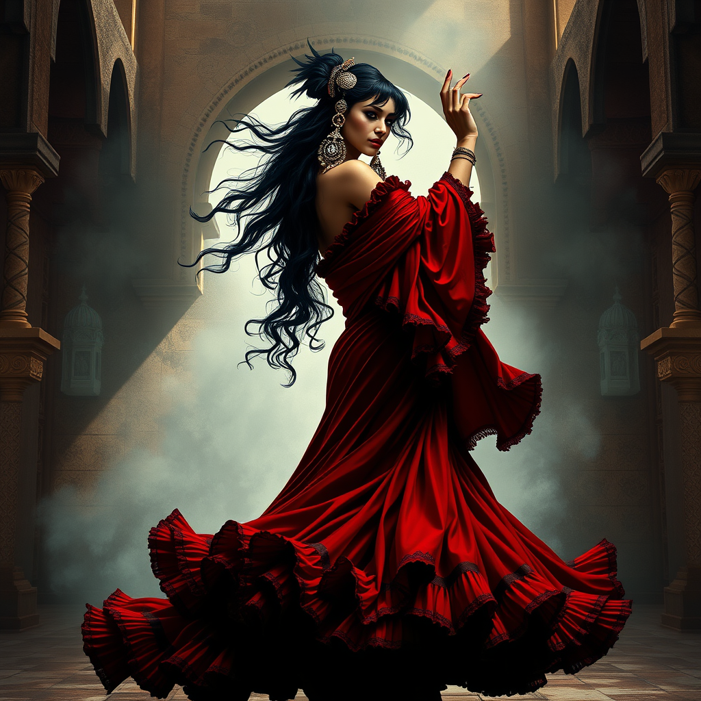 Four elaborate and oversized earrings accent the woman's black hair, cascading over her shoulders and complementing her flowing dress that reaches down to the floor. Her attire is further adorned with a grand shawl and a bata de cola, featuring an array of frills and flounces in a striking red and black color palette. In the backdrop, Mudéjar style blends with Romanesque architecture, setting the stage for her dynamic dancing pose. The scene is filled with passion, grace, and emotion, creating an epic composition marked by tribal dark fantasy elements and dramatic shadows, reminiscent of the evocative style of Fabian Perez.