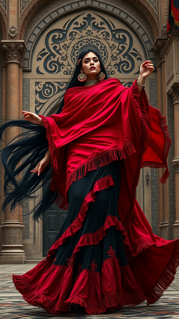 Four elaborate giant earrings adorn a woman with flowing black hair, cascading down as she wears an extremely long dress, its fabric trailing with elegance. A gigantic shawl drapes around her shoulders, complementing a bata de cola skirt embellished with frills and flounces, all in a striking red and black palette. Behind her, the intricate geometric patterns of Mudéjar style meld with the robust forms of Romanesque architecture, setting a majestic backdrop. Captured in a dynamic dancing pose, she embodies a portrait of passion and grace. The composition exudes emotion, with tribal dark fantasy elements and dramatic shadows, echoing an epic and mystical scene reminiscent of Fabian Perez's artistry.